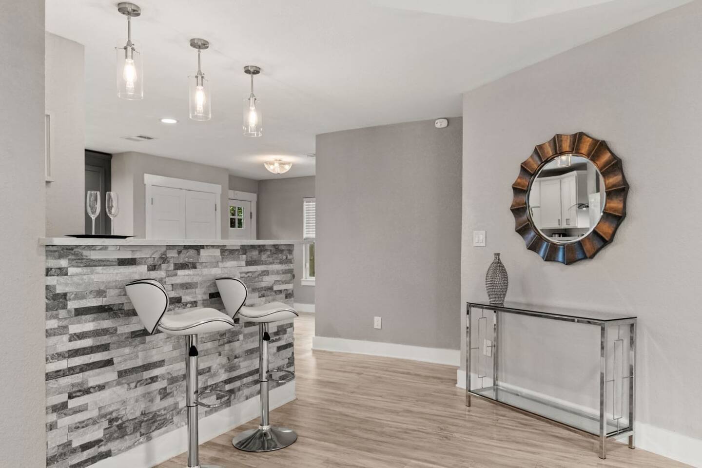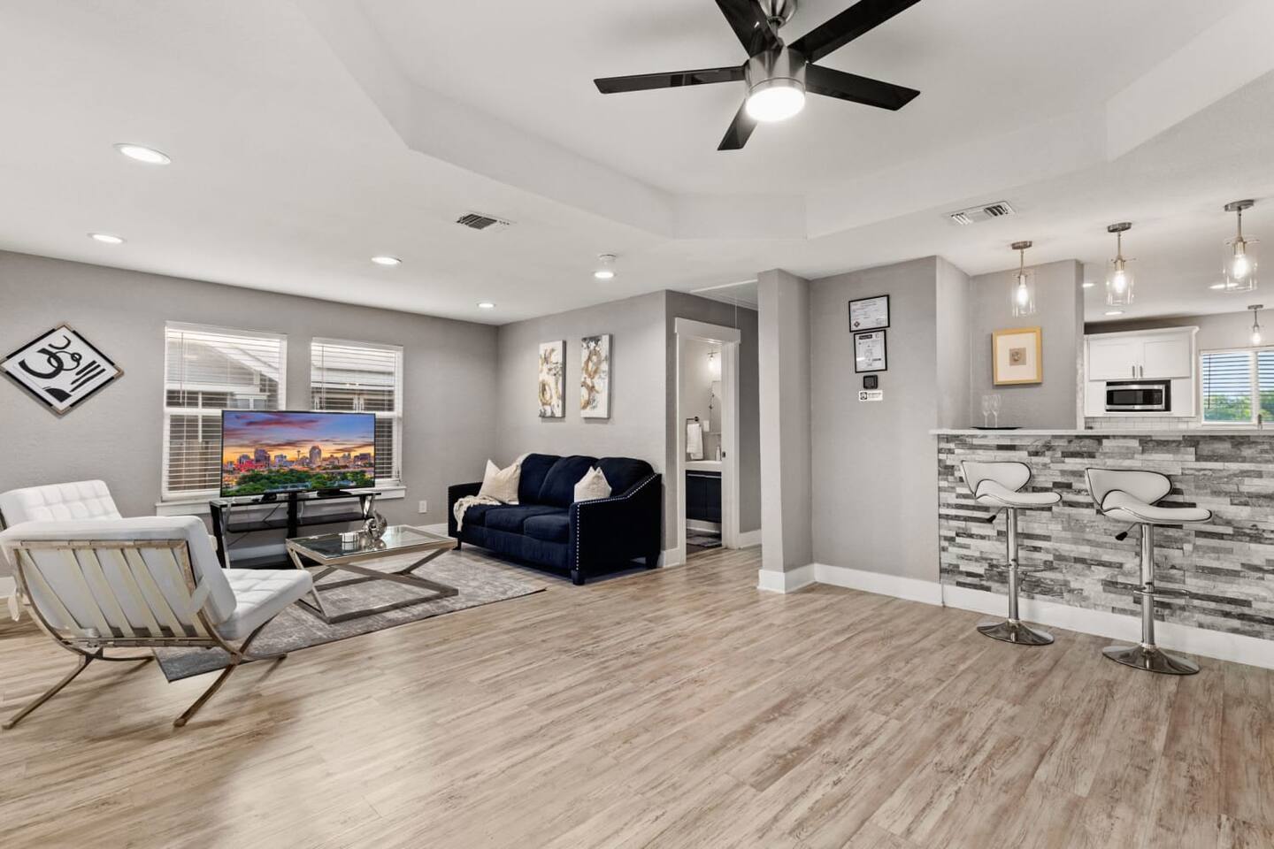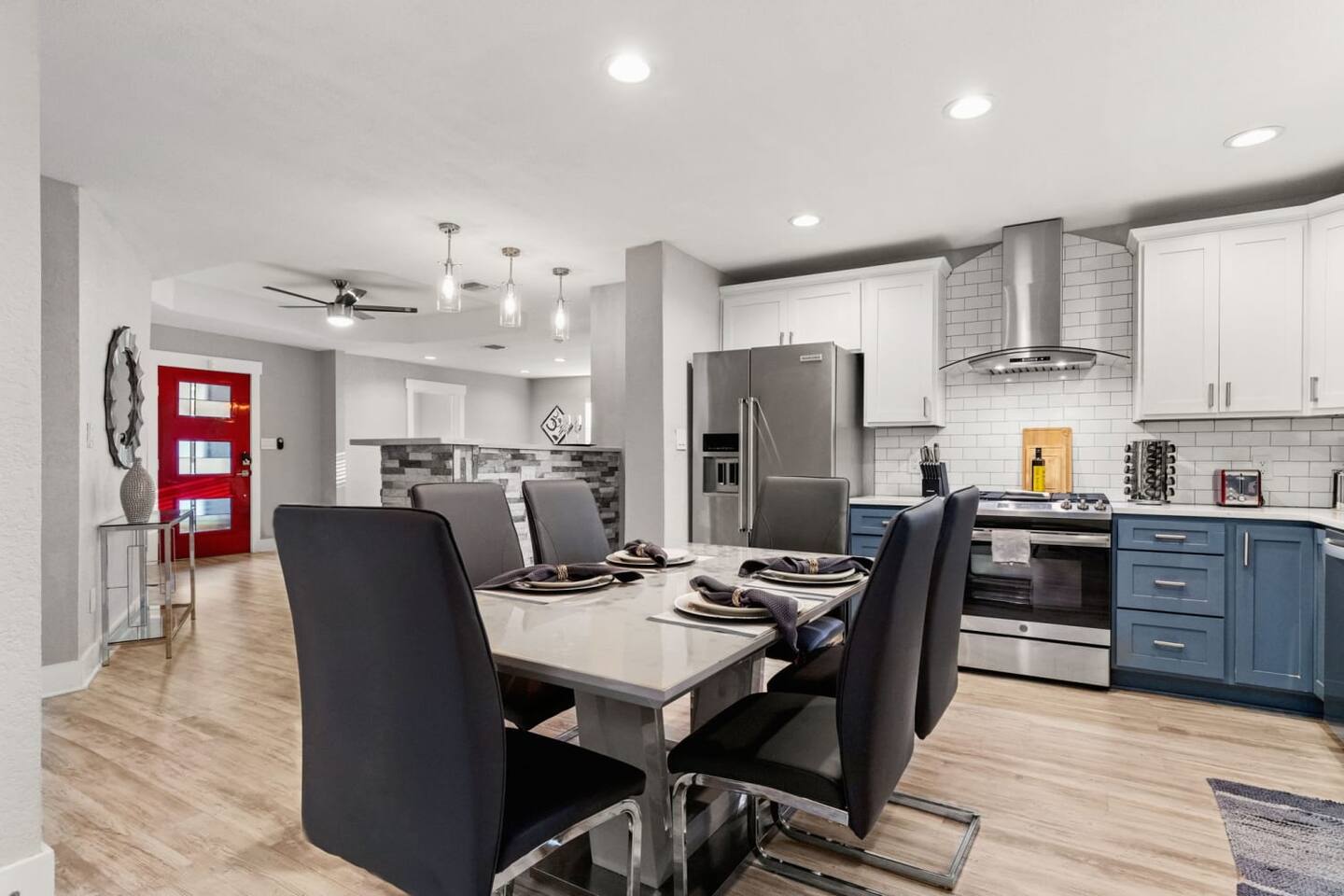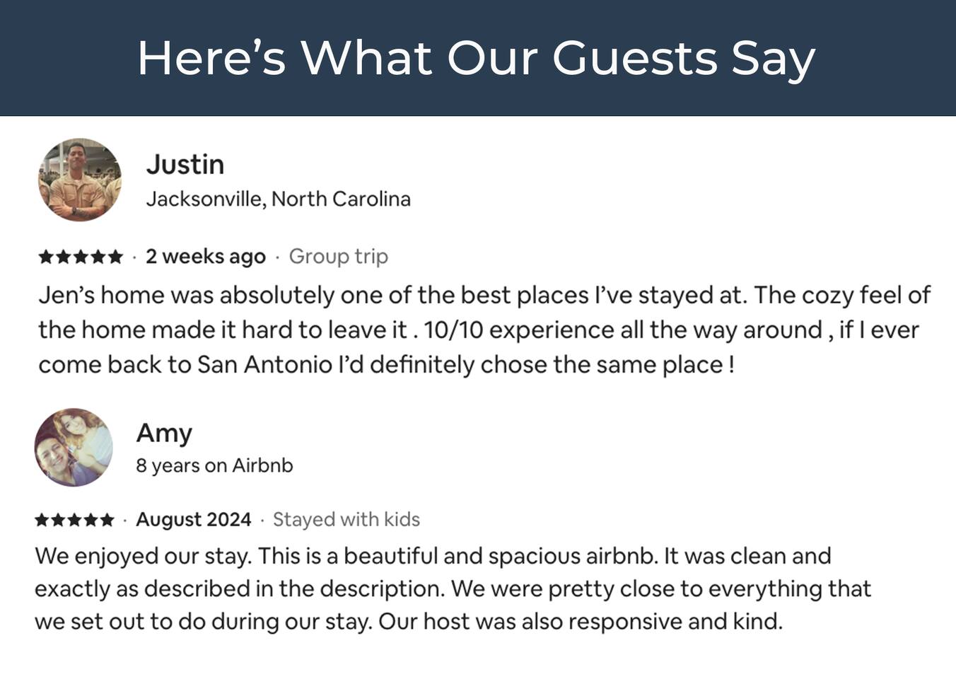 1.5 miles (5 min) from Alamodome 3.5 miles (7 min) from Civic Park 3 miles (5 min) from the River Walk 3 miles (5 min) from the Alamo 5 miles (10 min) from The Pearl 6 miles (8 min) from the San Antonio Zoo 3 miles (6 min) from the King Williams Historic District 11 miles (13 min) from San Antonio International Airport 11 miles (13 min) from North Star Mall 20 miles (21 min) from Six Flags Fiesta Texas 16 miles (17 min) from SeaWorld San Antonio 2 miles (5 min) from H-E-B grocery Less than a mile from various restaurants -- BEDROOMS -- You will have plenty of room to spread out thanks to three spacious bedrooms. The master bedroom features a king-size bed, a Smart TV to watch your favorite shows, and an ensuite bathroom. The second bedroom is outfitted with a cozy queen-size bed and a smart TV. The third bedroom includes a full-size bed and dedicated workspace. If you’re traveling with little ones feel free to use the pack n’ play, stroller, and high chair. -- BATHROOMS -- The master bathroom features a huge shower with uniquely designed shower heads. The second bathroom boasts a shower/tub combo, along with plenty of drawer and counter space for all your personal items. Both upstairs bathrooms include towels and essential toiletries (body wash, shampoo, conditioner). -- KITCHEN -- Channel your inner chef while you’re on vacay in the fully loaded kitchen with everything you’ll need for whipping up tasty meals. Aside from all the kitchen basics, you’ll also find a toaster, a blender, and a dishwasher. Morning coffee is made easy with a coffee bar (frother, flavored syrups). When it comes time for enjoying your meals, you can cozy up to the bar seating in the kitchen, or head over to the dining table that seats 4 to 6 people. The kitchen/dining area is perfect for morning chats, family meals and game night. -- LIVING ROOM -- The living room is the first room you'll see when you enter the house. Spend your free time lounging on the modern furnishings or watching a movie on the Smart TV - complimentary Netflix included! -- OUTDOOR AREA -- You’ll find it easy to spend time outdoors when you stay here with the spacious fenced-in backyard. -- Book Today & Enjoy the Best of San Antonio! -- To abide by all legal requirements and property rules, you WILL be asked to provide a copy of your official government-issued photo ID, confirm your contact information, pass through our verification portal and, in some instances, complete a criminal background check. Failure to provide these documents will result in a cancellation and denied entry. IMPORTANT NOTE: The information is collected for verification only and is not stored or used for any other purposes.
